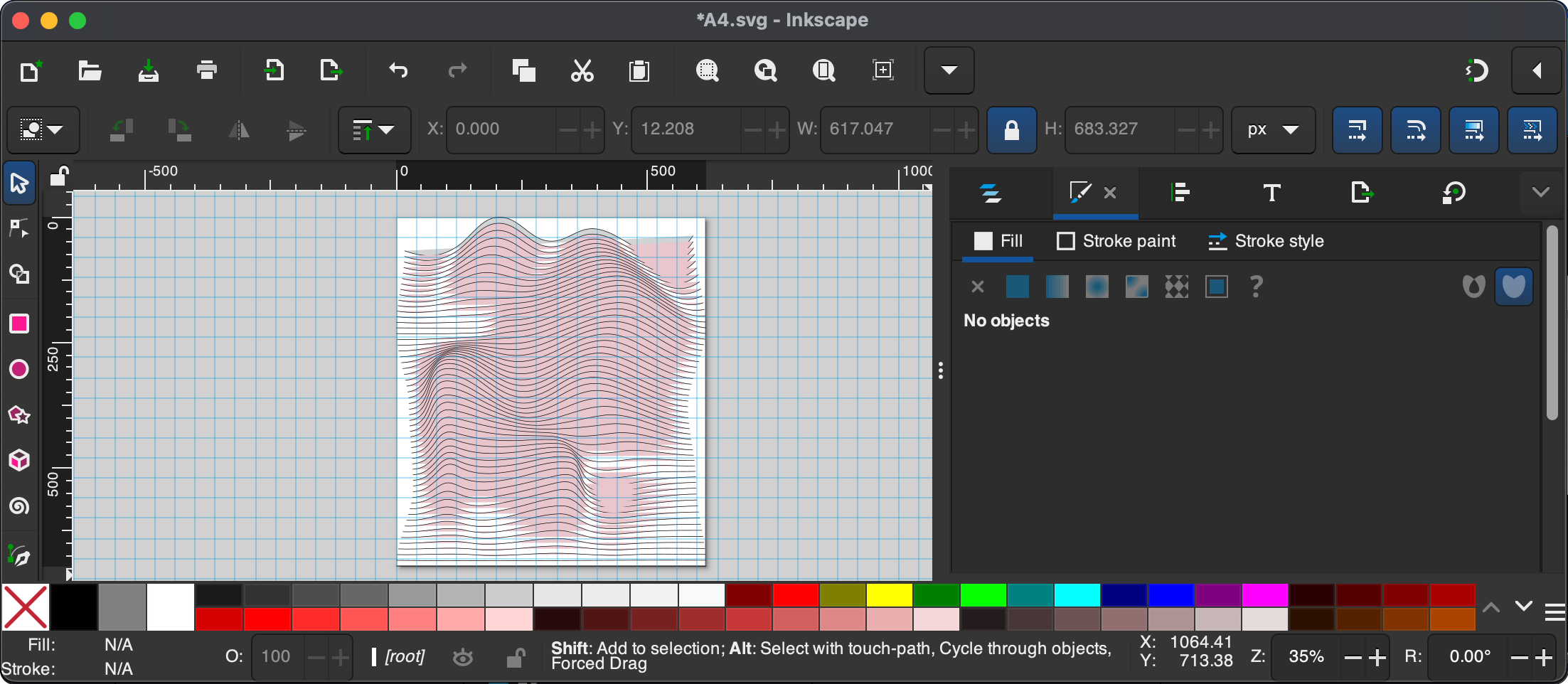 When I start working with a pen plotter, I often begin with SVG files, since the machine can read them directly. I create SVGs by designing artwork in Inkscape or Adobe Illustrator, then arrange, modify, and experiment with the composition before sending it to the plotter. -