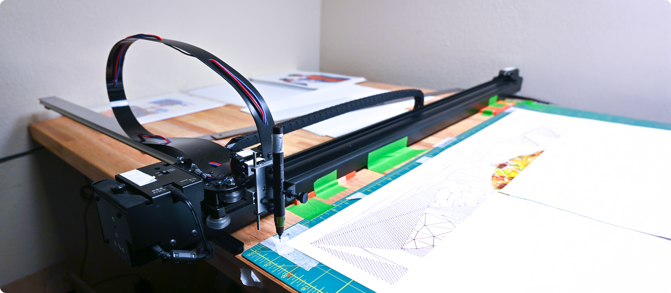 I began my plotting journey with the AxiDraw pen plotter, I even remember going to pick it up in person from their office in the Bay Area, California. Later, I upgraded for larger-format work, which offers an impressive 22×34" drawing area, allowing me to create more ambitious pieces.