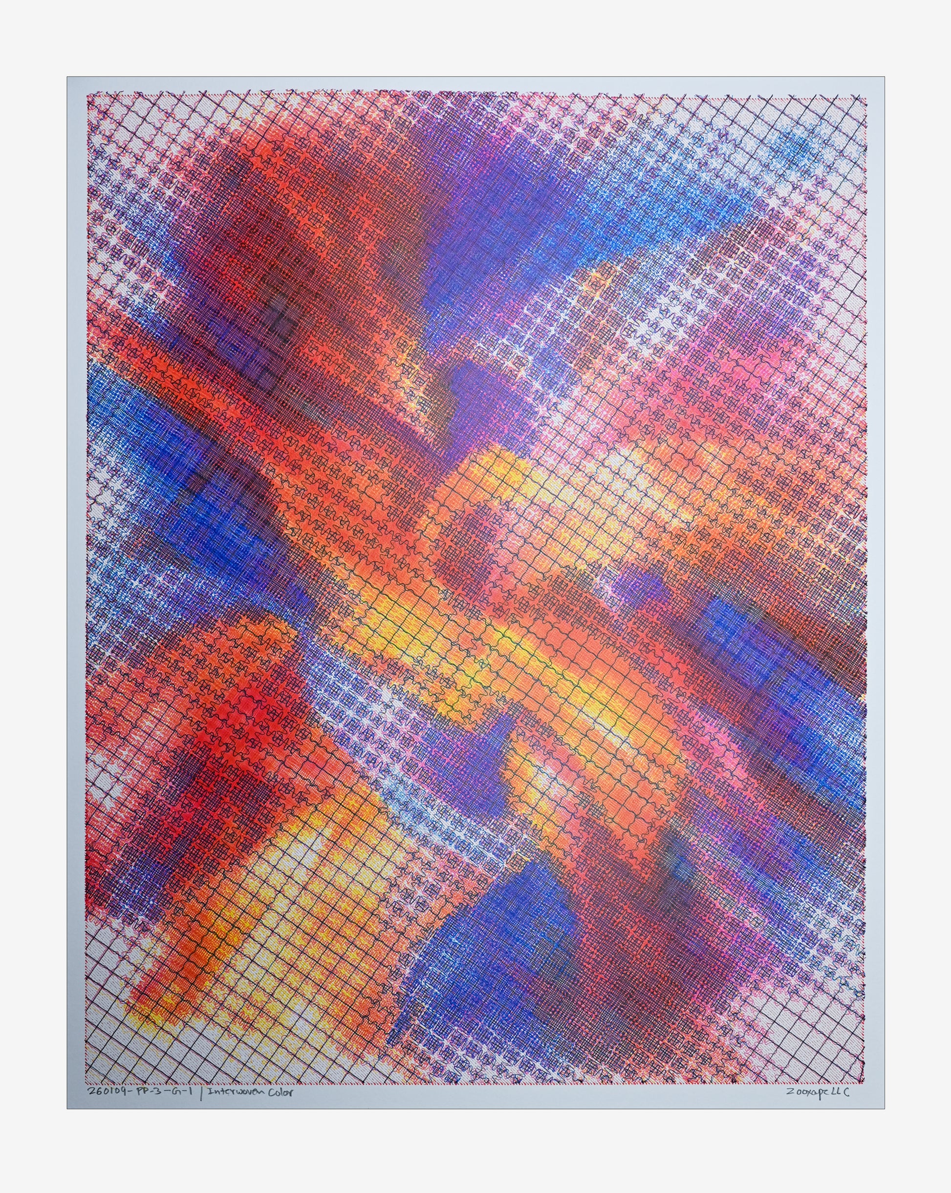 Interwoven Color is an algorithmic artwork rooted in generative printmaking, featuring a interwoven composition with a partially visible rhythmic interplay of color.