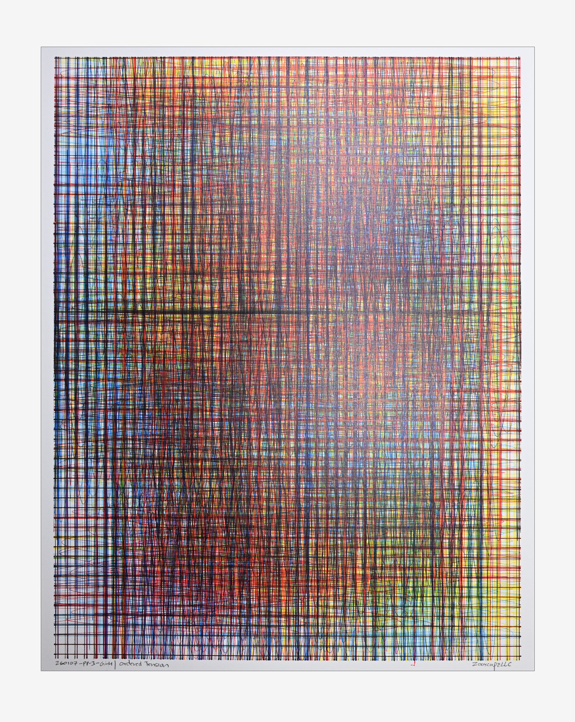 Ordered Tension is an algorithmic artwork rooted in generative printmaking, featuring a Featuring woven structures oriented in the T-direction, creating an integrated form from within.