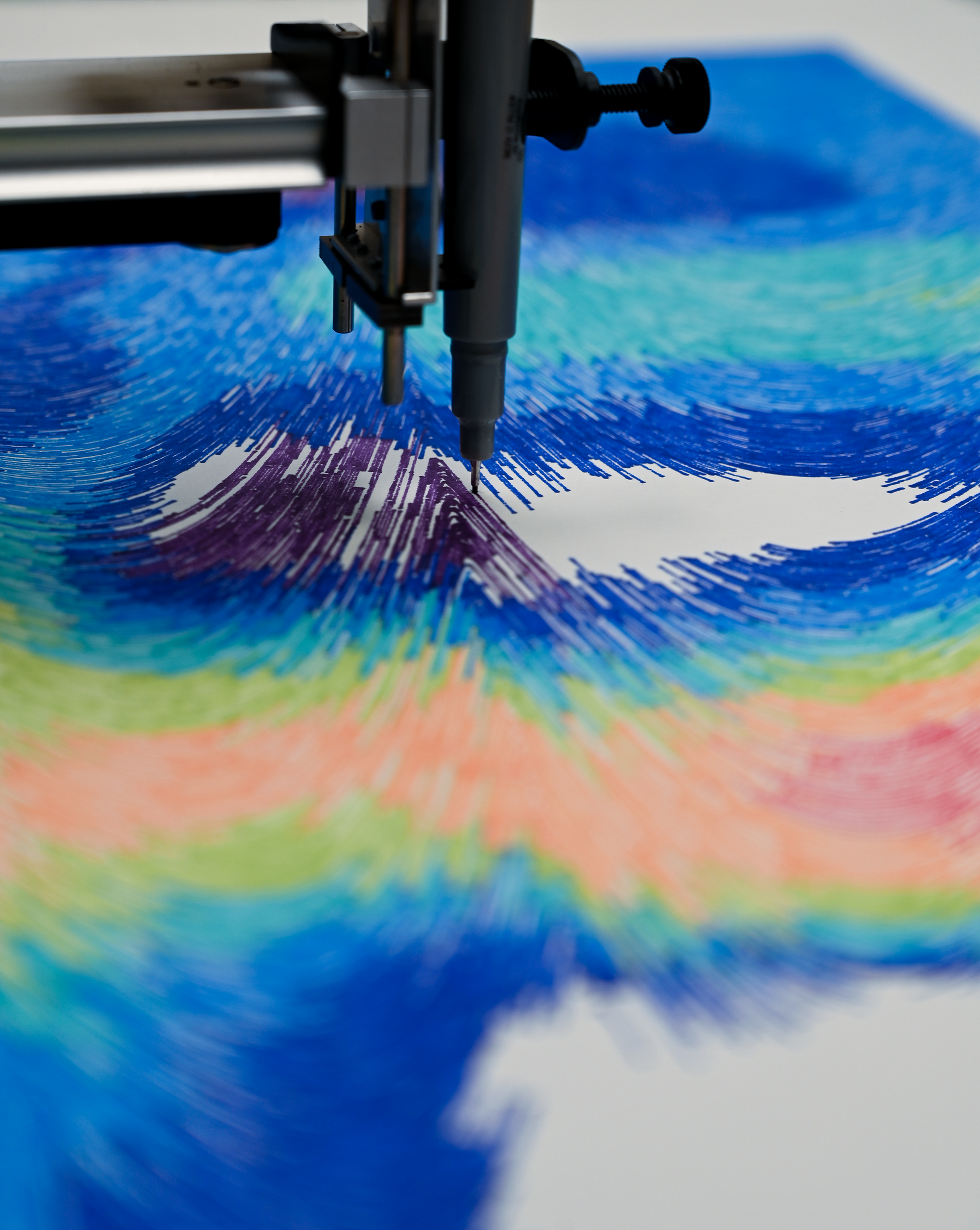 Mirrowake is a pen plotter art creation and generative art print that embodies algorithmic art precision. Layered waves in multiple colors radiate from the center, creating movement, depth, and the calm reflection of rippling water.