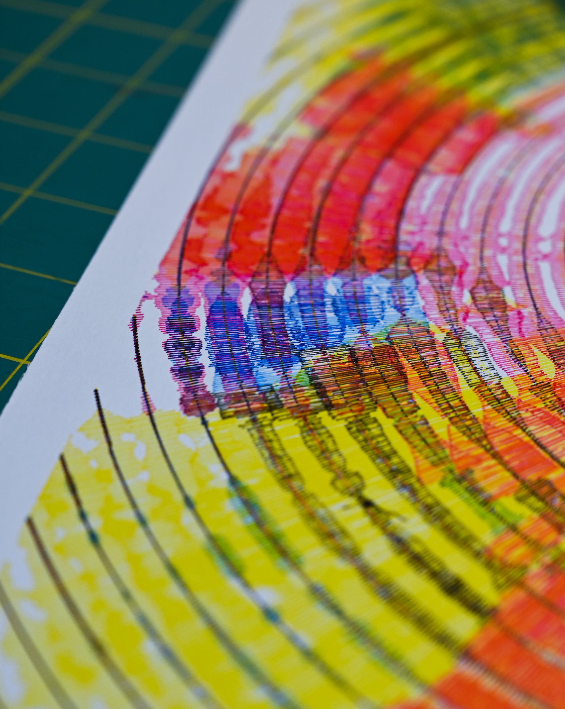 Tide Heart is a pen plotter art creation and generative art print that embodies algorithmic art precision, with multicolored waves rippling from the center to express a calm sense of connection.